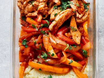 Enjoy our Chicken Fajitas w/ White Rice & Veggies Bowl, featuring tender, marinated chicken sautéed with colorful bell peppers and onions. Served over a bed of fluffy white rice and accompanied by fresh veggies, this flavorful bowl provides a satisfying and nutritious meal that captures the spirit of traditional fajitas!