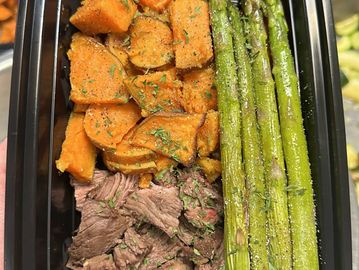 Indulge in our Steak w/ Asparagus & Sweet Potato Bowl, showcasing tender, grilled steak complemented by roasted sweet potatoes and vibrant asparagus. This dish combines rich flavors and nutritious ingredients, delivering a hearty meal that’s as satisfying as it is wholesome!